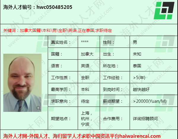海外人才,加拿大外教,本科,5年以上的教学经验,求职杭州、上海和宁波
